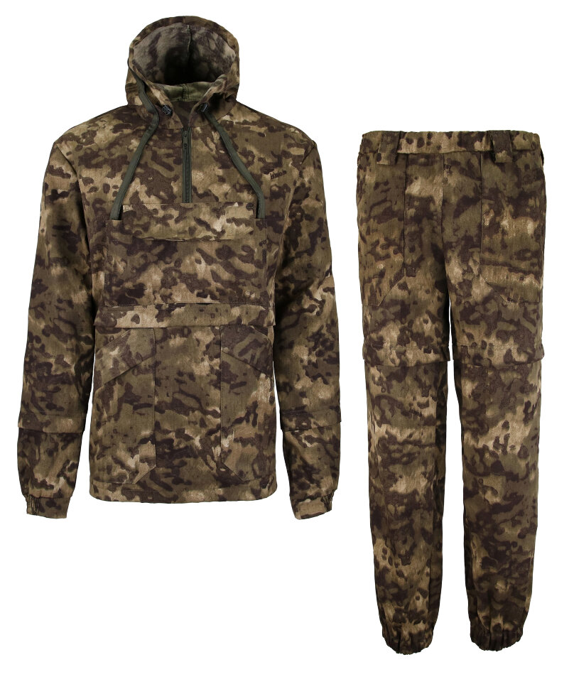 Состоит костюм из куртки-анорак с капюшоном и брюк прямого кроя. Капюшон регулируется по объему, а съемная вставка из противомоскитной сетки застегивается на молнию, или убирается в карман на груди. Костюм оснащен специальными ловушками для клещей – на рукавах, куртке, брюках. Пояс брюк собран на широкую эластичную резинку, есть шлевки для ремня. Низ брюк на резинке.