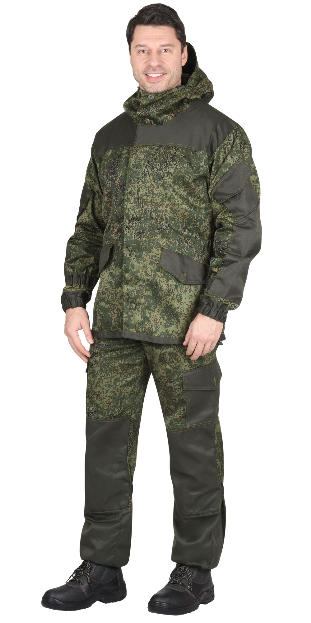 Ткань: «КМФ»: 50% п/э, 50% х/б. Куртка удлиненная прямого силуэта, с супатной застежкой на пуговицы, с втачным капюшоном с козырьком, с усилительными накладками, с прорезными карманами листочка и фигурными клапанами на пуговицу, с внутренним карманом. Рукава с накладными полуобъёмными карманами и фигурными клапанами застегивающиеся на липучку, с налокотниками, с манжетами частично стянутыми резинкой. Куртка по линии талии частично стянута резинкой по бокам, по низу куртка регулируется шнуром. Брюки прямого силуэта, с пристёгивающимися помочами (подтяжки), с гульфиком застегивающимся на пуговицы, с цельнокроеным поясом, частично стянутым резинкой и застегивающимся на пуговицу, с разными многофункциональными карманами. С усилительными накладками, низ брюк на резинке. Брюки с пуфтами на завязках. ГОСТ 25295- 2003.