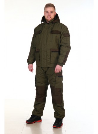 Костюм состоит из куртки и брюк.Куртка на поясе с центральной застёжкой на молнию, ветрозащитным клапаном на липучке, капюшоном на молнии . Накладные карманы с клапанами на липучке, с карманами на рукаве. Кулиса по линии талии.Брюки прямые с боковыми и накладными карманами с клапанами, притачным поясом на резинке. Усилительные накладки в области колен и локтей из непромокаемой ткани, талия и низ брюк на резинке.Изготовлен из ткани палатка (270 гр.) + флис (180 гр)+синтепон (200 гр)