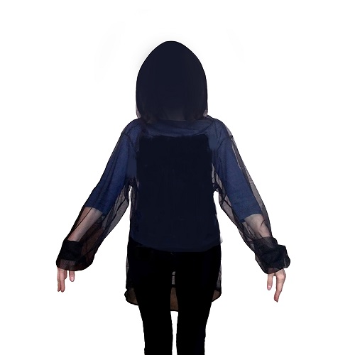 Легкая компактная куртка из антимоскитной сетки черного цвета.Одевается поверх одежды, защищает тело человека от комаров, слепней, клещей и мошки. Расстегивается спереди по кругу горловины и одевается через голову. На рукавах плотно прилегает к запястьям манжетами, которые мешают так же проникновению клещей к телу. Рукава удлинены, образуются складки которые препятствуют укусам кровососущих насекомым. Хорошо продувается,можно использовать в жаркие дни.