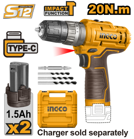 Аккумуляторная ударный шуруповерт 128 20Нм 18+1+1, USB type-C SUPER INGCO CIDLI12202 серии аккумуляторного инструмента USB type-C S12 предназначен для сверления отверстий в пластике, древесине, металле, закручивания саморезов, винтов и прочих крепёжных элементов при сборке мебели, монтаже различных конструкций, выполнении ремонтных, строительных и отделочных работ как внутри зданий, так и на улице.
