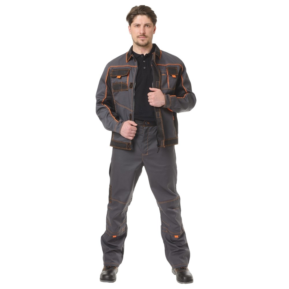 Комплект состоит из куртки прямого силуэта и прямых брюк с притачным поясом, в местах подверженных напряжениям (углы и раскрытия карманов) предусмотрены усилительные закрепки. Куртка с отложным воротником застегивается на молнию с удобным пуллером, в месте застегивания предусмотрен цельнокроеный клапан на контакт-ленту. Прямые брюки с анатомическим кроем коленей дополнены объемными карманами с местом для амортизационных накладок.