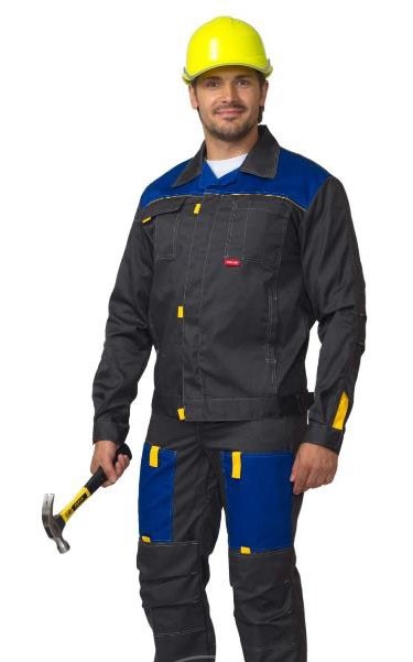 Сырье: Тк. "CROWN-230" 20% х/б, 80% п/э, поверхностная плотность 230 г/кв.м Описание: Кант жёлтый. Куртка укороч., с потайной застёжкой на "молнию". П/комб. с наколенниками-карманами. ГОСТ 27575-87.