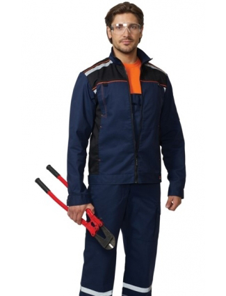 Сырье: Тк. "CROWN-230" 20% х/б, 80% п/э, поверхностная плотность 230 г/кв.м Описание: Куртка прямого силуэта, короткая, с воротником стойка, с центральной застёжкой на 1-замковую тесьму - "молнию", с подрезными бочками, с верхними и нижними карманами в швах, с притачным поясом регулирующимся по ширине при помощи хлястиков и кнопок. Рукава с манжетами на кнопках. Полукомбинезон с застёжкой гульфика и застёжкой в правом боковом шве на три петли и пуговицы, верхним накладным карманом и нижними внутренними боковыми карманами, с наколенниками, с накладным карманом на левом боковом шве с клапаном на кнопке с патой, с двумя задними и карманами для инструментов, по спинке вставлена резинка.