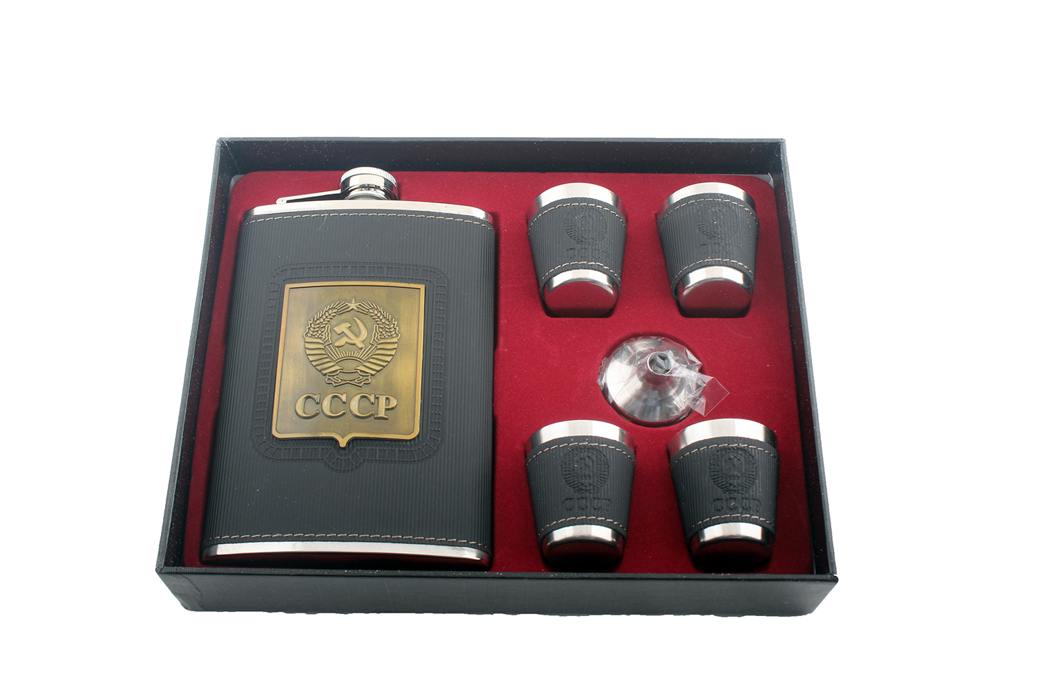 Фляги обшитой кожей с метал вставкой герба СССР . 4 обшитых кожей стопок с гравировкой герба СССР. Горлышко для залива жидкости во флягу. Объем фляги: 0.23~ литра.Конструктивные особенностиСостояние новое
